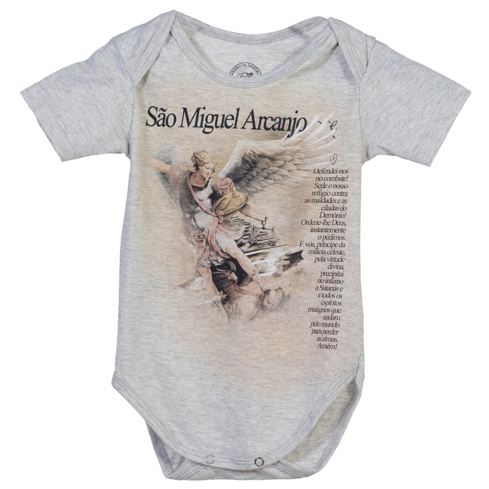 O body infantil unissex São Miguel Arcanjo é confeccionado em Cotton (48% algodão + 48% poliéster + 4% elastano), na cor toque de outono.