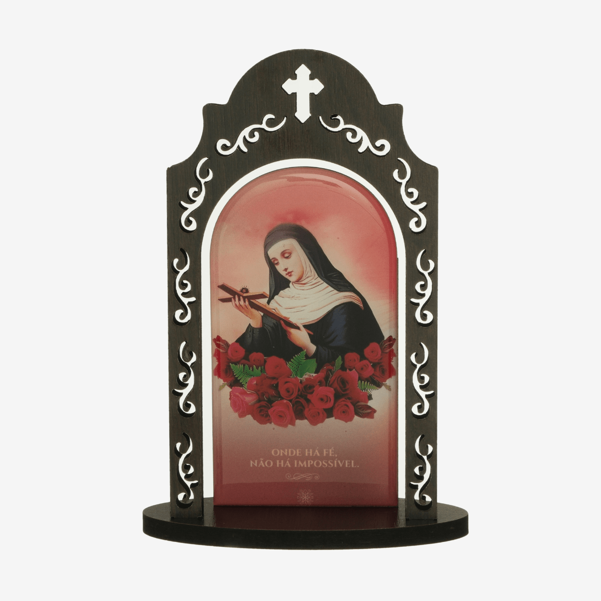 Esta linda capela vazada de Santa Rita de Cássia inteiramente produzida em MDF, na cor marrom escuro a peça contém pequenos detalhes vazados, assim com uma cruz vazada no meio da parte superior dela. A imagem da Santa das Causas Impossíveis é resinada e mostra ela em um fundo rosa, olhando para o Crucifixo em suas mãos e ao seu redor, rosas vermelhas. Há também a inscrição da frase "ONDE HÁ FÉ, NÃO HÁ IMPOSSÍVEL.".