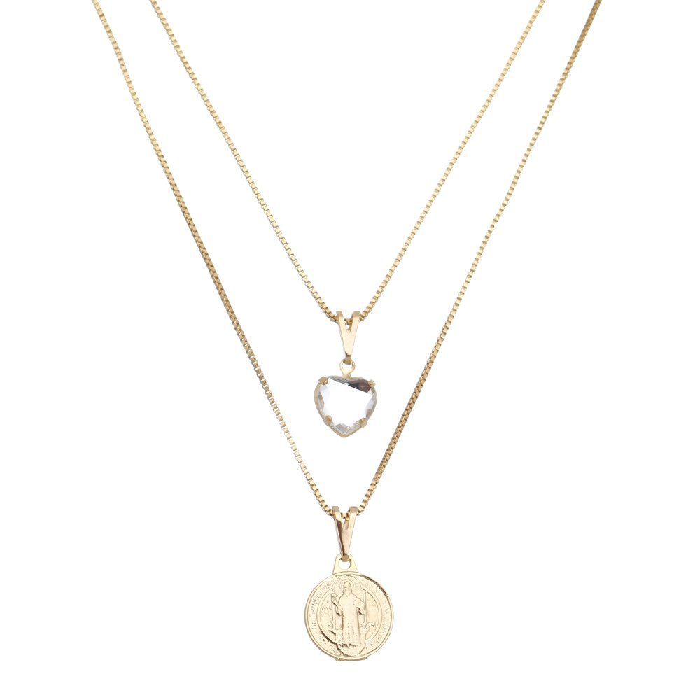 Colar duplo com medalha de São Bento e pingente de coração de cristal.