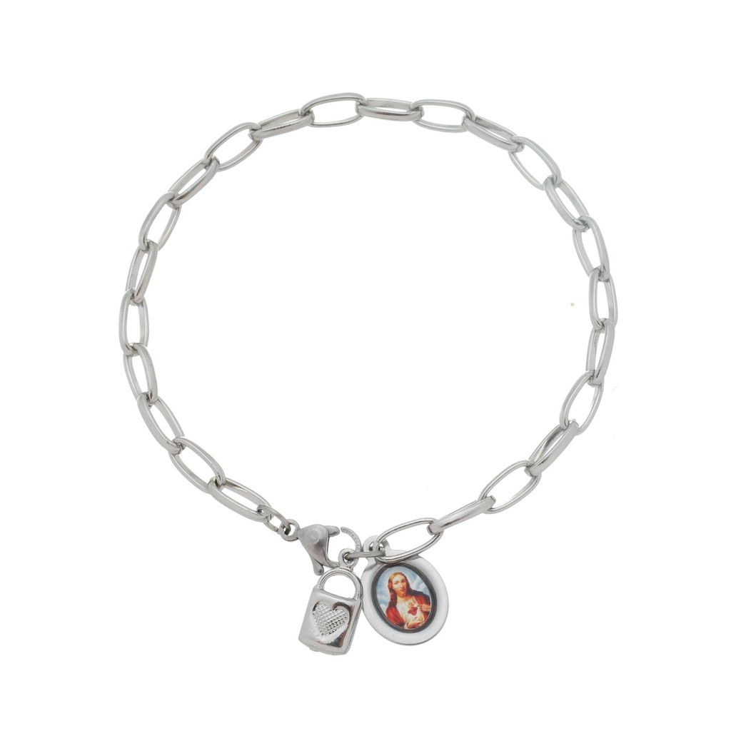 Pulseira Cadeia da consagração com medalha do Sagrado Coração de Jesus Especificações: Pingente: 1,4cm altura x 7cm largura Medalha: 1,6cm altura x 1,1cm largura Pulseira: 20cm ***Medidas aproximadas***