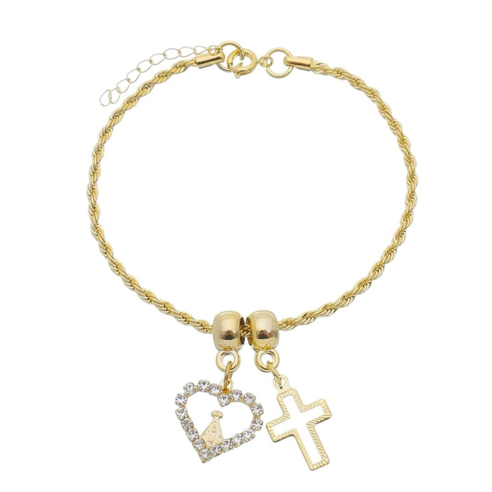 Pulseira Nossa Senhora Aparecida com Pingente Coração e Cruz