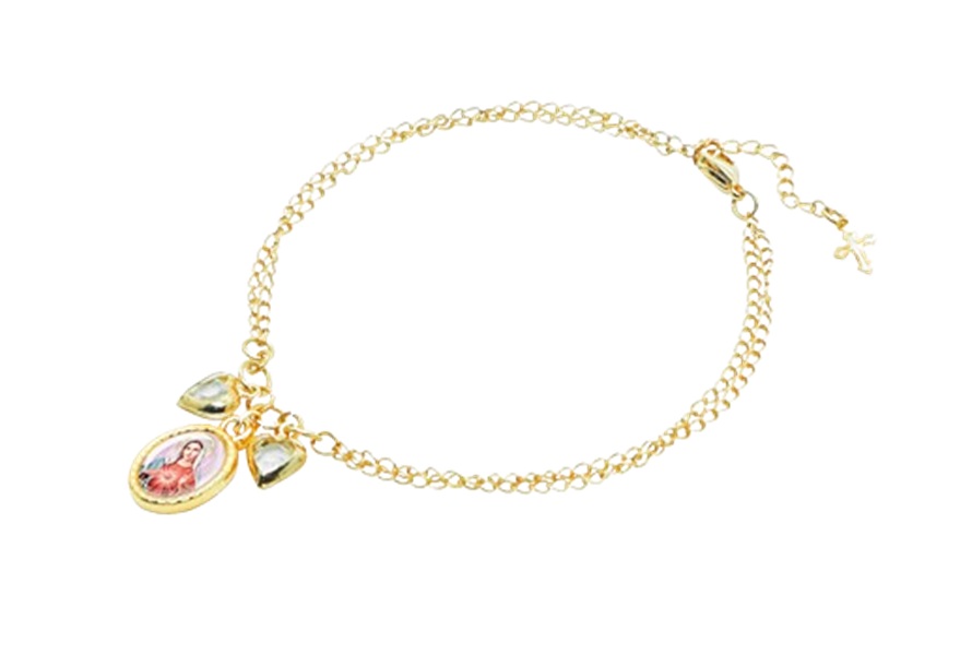 A fé em forma de delicadeza. A Pulseira Imaculado Coração de Maria é uma peça folheada em tom dourado, com um brilho suave e elegante. Destaque para a medalha resinada e os detalhes em strass, que acrescentam charme e sofisticação à joia.