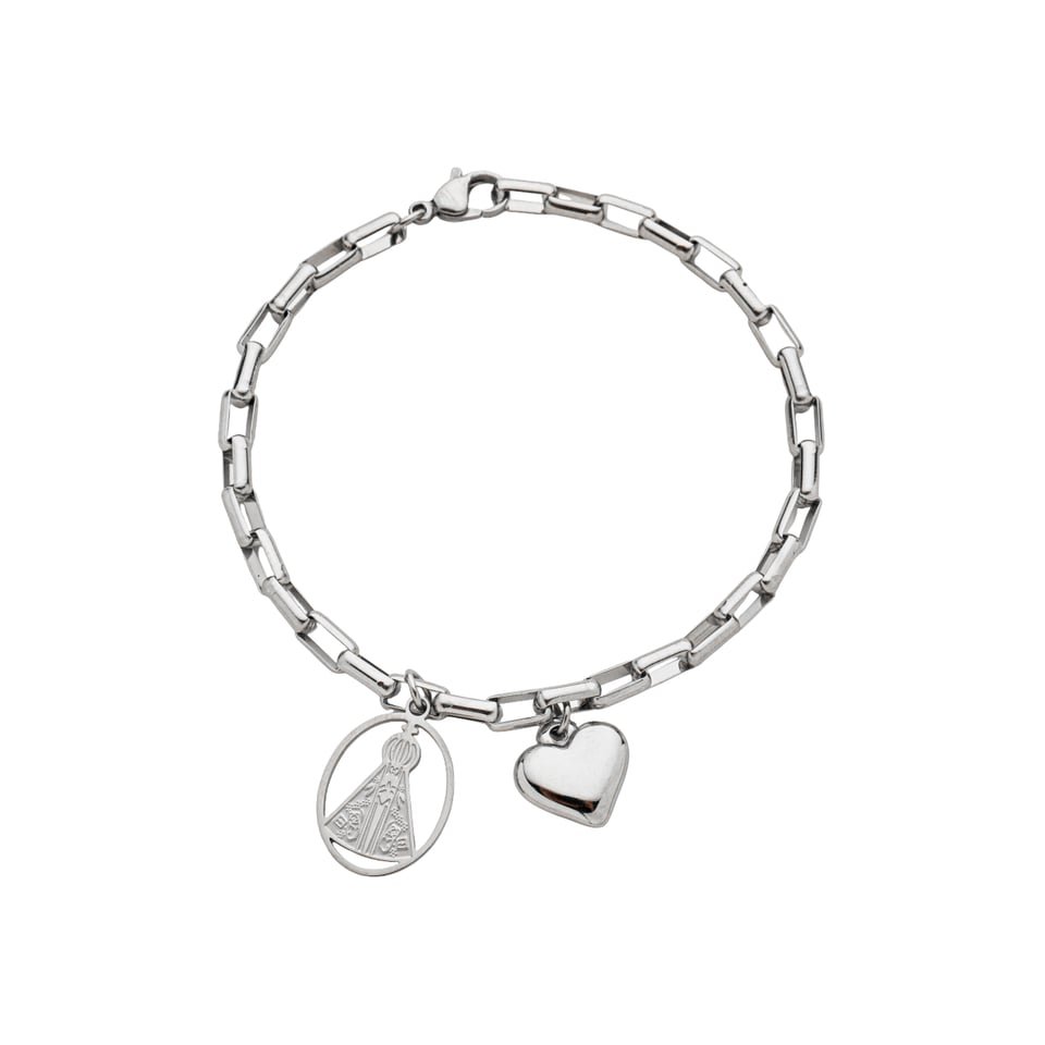 Pulseira Nossa Senhora Aparecida em Inox Pingente de Coração e Elos Quadrados
