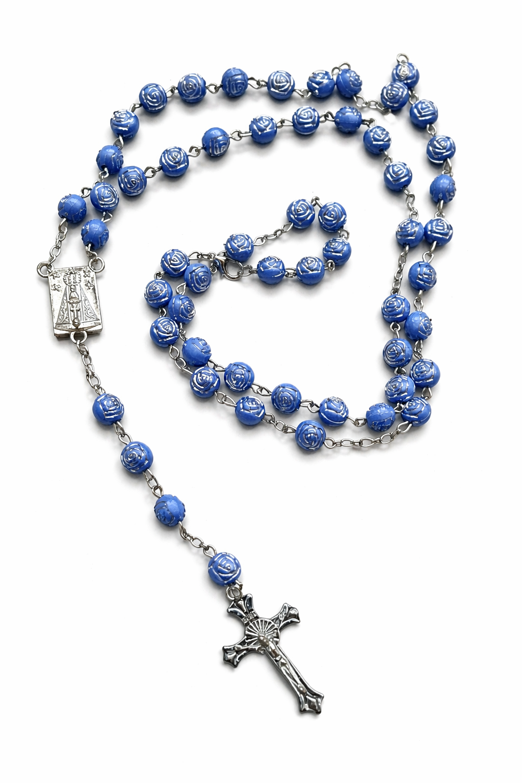 Delicado e cheio de significado, o Terço Colar Nossa Senhora Aparecida é uma linda expressão de fé, devoção e amor à Mãe Aparecida. Suas contas em formato de rosas, na suave cor Azul, simbolizam a pureza, a oração e a entrega confiante a Deus.