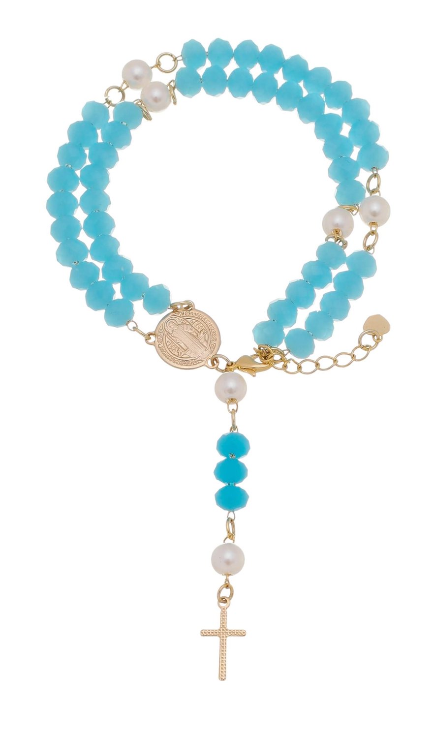 Esse terço de pulso é uma peça folheada muito bonita com as contas das dezenas em cristal azul turquesa e as contas do Pai Nosso em pérolas! O seu entremeio é uma medalhinha de São Bento e logo abaixo dela, você encontra o abotoador da peça. Em sua composição esse item revela beleza e fé! Ele é ideal para quem gosta de acessórios delicados e uma ótima opção para presentear pessoas queridas! Pode ser usado no dia a dia em diferentes ocasiões como pulseira e para auxiliar em oração!