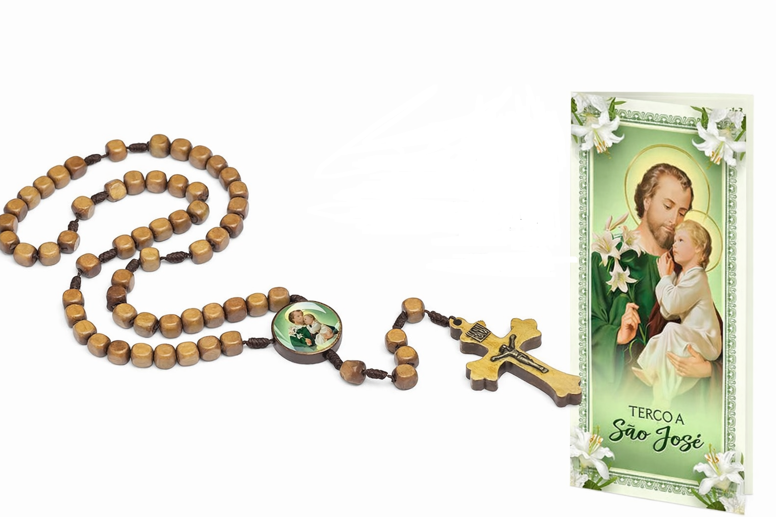 Possui contas quadradas de 8 mm, entremeio com a imagem de São José em resina e cruz resistente, acompanhando folheto explicativo com a oração de São José e instruções de como rezar o terço.