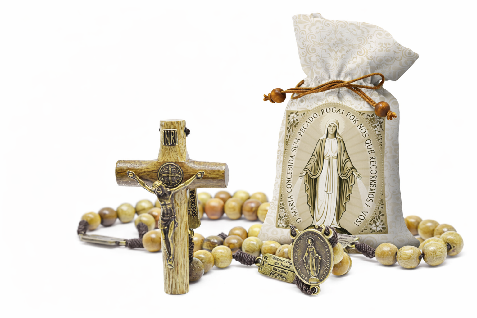 Acompanha saquinho de tecido para guardar e proteger o terço.